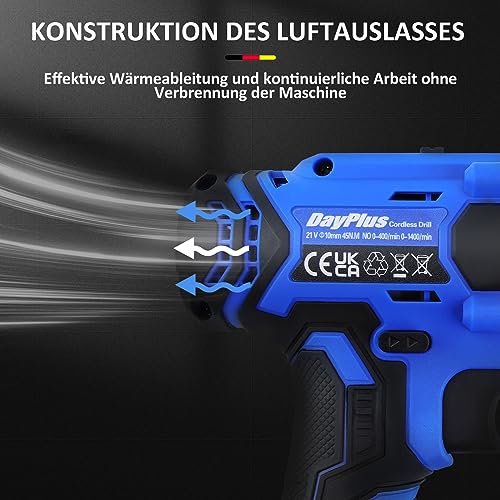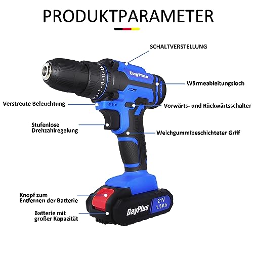 👍[25 + 1 Drehmoment] Dieser 21V Akkubohrer verfügt über eine 25+1-Drehmomenteinstellung mit einem maximalen Drehmoment von 45NM. Es gibt vulgo 2 Geschwindigkeitseinstellungen (0-400/0-1400 RPM), die für verschiedene Bohr-, Installations- und Wartungsarbeiten angebracht sind. Maximale Bohrleistung (Eisen): 10mm; Max. Bohrleistung (Holz): 23 mm