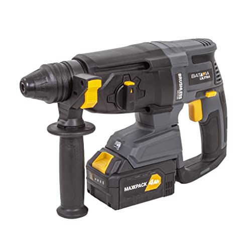Merkmale des bürstenlosen Bohrhammers SDS+ * Perfekt zum Bohren und Meißeln in Stein, Beton, Ziegel und Mauerwerk * 3 Positionen für vielseitigen Einsatz: Bohren, Schlagbohren, Meißeln inkl. Meißelarretierung * Bürstenloser 18-Volt-Anlage mit 2,2 Joule Schlagenergie * Universeller SDS-Plus-Bithalter * Belieferung im stabilen Koffer mit Zubehör * Pneumatisch (luftbeaufschlagt) Technische Daten * Batteriespannung: 18 Volt Li-Ion * Leerlaufdrehzahl: 0 – 1.200 U/min * Schlagfrequenz: 0 – 5.300 bpm * Schlagkraft: 2,2 Joule * Bohrleistung: 26 mm auf Stein aufladbare Batterie-Schlagbohrmaschine Batavia Ultra Der Batavia Brushless SDS+ Bohrhammer ist das perfekte Werkzeug zum Bohren und Meißeln in Stein, Beton, Ziegel und Mauerwerk. Es ist ein leistungsstarkes Werkzeug mit vier verschiedenen Modi: Bohren, Schlagbohren, Meißeln und Meißelsperre. Wo der „normale“ Bohrmodus für normale Bohrtätigkeiten im Rahmen ist, eignet sich die Schlagbohrfunktion perfekt zum Bohren in harten Oberflächen wie Beton und Stuck; Dies ist aufgrund der Schlagbewegung des Hammers vielleicht, die mehr Schlagkraft erzeugt. Dessen ungeachtet eignet sich dieser Bohrhammer mit dem Meißel und der Meißelarretierung bekannt als zum Meißeln in harten Materialien. Diese letzte Position ermöglicht es Ihnen, die Position des Meißels anzupassen – dies gewährleistet maximalen Bedienkomfort. Dank des leistungsstarken bürstenlosen 18-V-Motors hat der Batavia-Bohrhammer eine Schlagfrequenz von bis zu 5.500 pro Minute, bei einer Schlagenergie von 2,2 Joule und einer Bohrleistung in Beton von 23 Millimetern. Der bürstenlose Anlage sorgt Dessen ungeachtet dafür, dass der Bohrhammer länger mit einem aufladbare Batterie betrieben werden kann, mehr Power beim Umackern und die Flieger selbst eine längere Lebensdauer hat.Da dieses Werkzeug für verschiedene Anwendungen im Rahmen ist, ist dieser Bohrhammer mit einem variablen Geschwindigkeitsschalter ausgestattet. So können Sie die Flieger perfekt auf den Job anpassen, der auf Sie wartet.