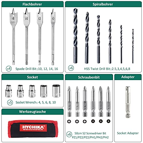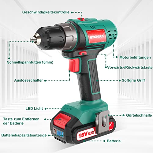 Akkuschrauber, HYCHIKA 18V 35N·m Akku Bohrschrauber mit 2.0 Ah Akku, 21+1 Drehmomenteinstellung und variable Drehzahlen, 1H Schnellladung, 22PCS Zubehör und Tragetasche für Bohren und Schrauben