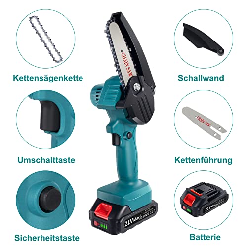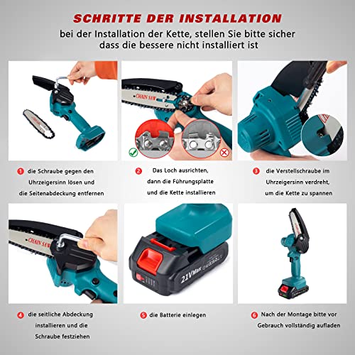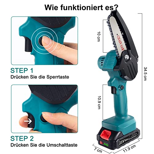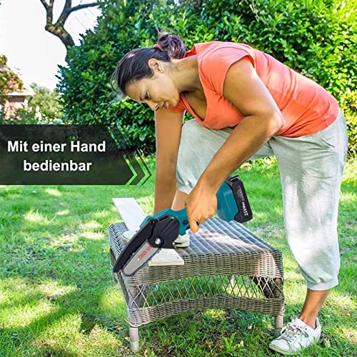 Einfach zu Bedienen: Unsere mini kettensäge wurde installiert und Sie müssen die Kette nicht nochmal installieren. Darüber hinaus ist es mit einem Ersatzakku und einer Aufbewahrungsbox ausgestattet, die sich bequem im Freien transportieren und verwenden lässt. Sehr gut passend für Gartenschnitt, Strauchschnitt usw.