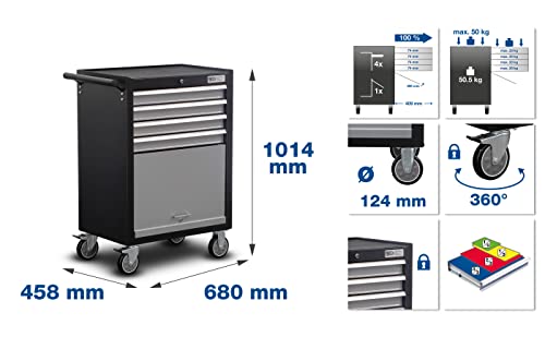 hochwertige Werkstattausführung | stabile Stahlblechkonstruktion | pulverbeschichteter Korpus, allerbest resistent vs. Kratzer | hochbelastbare, kugelgelagerte Rollen, davon 2 feststellbare Lenkrollen