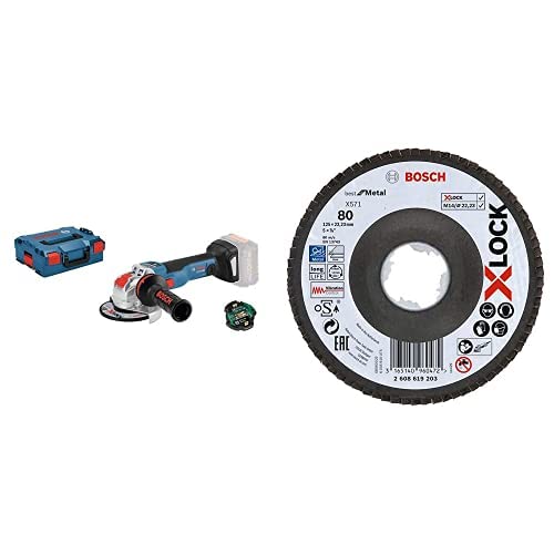 Bosch Professional 18V System Akku Winkelschleifer GWX 18V-10 PC (mit X-LOCK, Ø: 125mm, in L-BOXX 136) + Gewinkelte Fächerschleifscheibe Best (für Metall, X571, Ø125 mm, Körnung K80)
