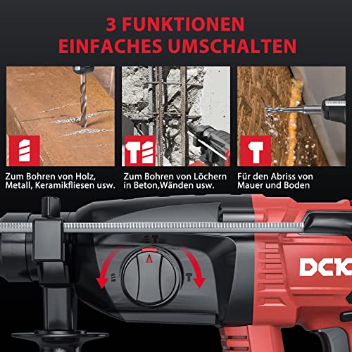[3-in-1 Funktion] Der DCK Akku Bohrhammer kombiniert Elektrobohrer, Elektrohammer und Hammerschlager in einem und passt sich einer Vielzahl von Arbeitsszenarien an, die einfach umzuschlten sind. Die Bohrmaschine mit dem SDS-plus-Schnellspannfutter lassen sich die Bohrer werkzeuglos und schnell wechseln und ohne Müde wechseln.