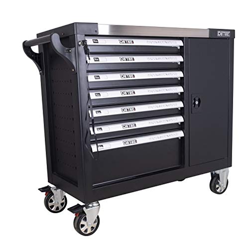 DeTec. 1077 Heavy Duty XXL Werkstattwagen bestückt 7/7 Schubladen gefüllt mit Werkzeug Carbon Einleger in blau (Werkzeugwagen mit Rollen | Bestückt mit Werkzeug | XXL Format)