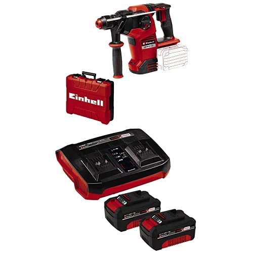 Lieferumfang – Das aufladbare Batterie-Bohrhammer Kit wird geliefert mit einem 3,0 Ah Power X-Change aufladbare Batterie und Ladegerät, in einer Einhell-Box mit Bit-Zwischenstück, 3 Bohrern, einem Flachmeißel und einem Spitzmeißel.