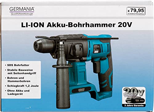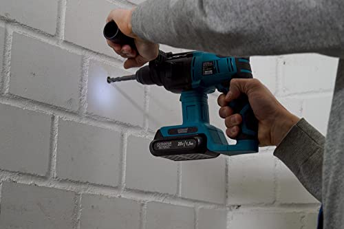 Der wiederaufladbare Batterie Bohrhammer von GERMANIA mit Zusatzhandgriff ist mit seinen 2 Funktionen: Bohren und Hammerbohren allumfassend einsetzbar