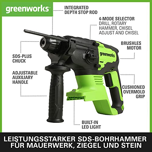 LEISTUNGSFÄHIGER SDS-BOHRHAMMER FÜR STEIN & MAUERWERK – der robuste SDS-Bohrhammer ist ergonomisch und verfügt über ein helles LED-Licht anstatt Ackern im Dunkeln. Er bohrt schnell Löcher bis zu 24 mm Durchmesser in Stein/Beton und 13mm in Stahl