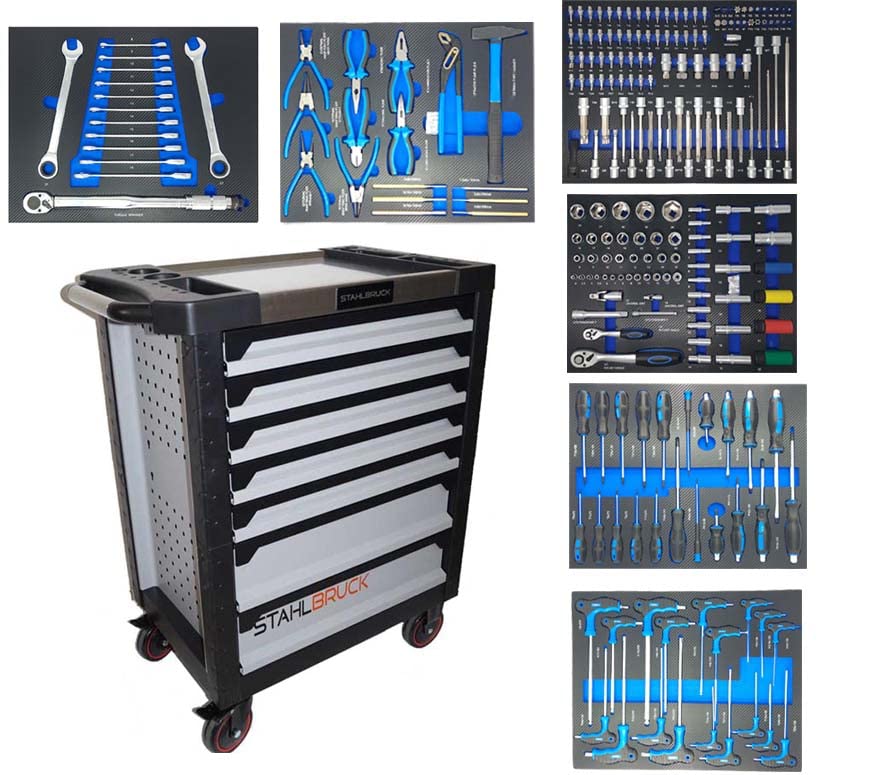 Der Werkstattwagen GW Black Line kommt mit einem 226-teiligem Werkzeugset zu Ihnen, welches erschütterungsfest in Schubladen mit kugelgelagertem Vollauszug verstaut ist. In Punkto Sicherheit und Standkraft überzeugt er durch eine Auszugsicherung der Schubladen, den Kantenschutz, die Zentralverriegelung mit 2 Schlüsseln und den Feststellbremsen an den beiden Lenkrollen – so bleibt die Gesamtheit dort wo es hingehört, Aka wenn der Wagen bewegt wird. Die genormte Lochung der Seitenwände ermöglicht zahlreiche zusätzliche Erweiterungsmöglichkeiten zur Anbringung von Zubehör wie beispielsweise zusätzlichen Werkzeughaltern. Aka die Ordnung kommt nicht zu kurz, wie durch die übersichtlich gestalteten Werkzeuginlays findet nicht mehr da sofort was er sucht. Die große Ablagefläche schützt mit Ihrem Rahmen vor dem Hinabrollen, bietet sichere Fächer für Kleinteile und Sprühdosen und macht diesen Werkstattwagen so zum perfekten Gefährten für Ihre Werkstatt.