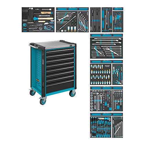 Anwendung: Effiziente, mobile Organisation von Werkzeug Werkzeug-, Material- und Montagewagen 7 flache Schubladen und 1 hohe Schublade Komplett mit 317-teiligem Werkzeug Sortiment in Safety-Insert-System Weichschaumeinlage Arbeitsflächen Ausnehmend vergrößerte Ablagekasten- und Arbeitsfläche in Edelstahl Komplett abgedichtete Arbeitsfläche schützt Wageninneres bei auslaufenden Flüssigkeiten In Arbeitsfläche integrierte Schnittstellen für Zubehör wie Laptop-Halter und Aufsatzmodule Edelstahl-Arbeitsfläche Besonderer Abschirmung durch hochwertige Kunststoff-Endkappen Korpus / Fahrgriff Extrem robuste Transaktion durch doppelwandige Konstruktion Komplette Schweißkonstruktion des ganzen Korpus für den täglichen harten Werkstatteinsatz Optimierter, nachgebender Kantenschutz an allen vier Ecken mit echtem Aufprallschutz durch innenliegendes Dämpfungskonzept Ergonomisch optimierter Fahrgriff für bessere Agilität Fahrgriff Edelstahl gebürstet Verriegelungs-Konzept Ergonomisch angeordnete seitliche Schlossposition zur besseren Bedienbarkeit schützt Schlüssel und Schloss vor Beschädigungen Hochsicher angelegte Schließanlage mit Zentral-Verschlusstechnik zum optimalen Abschirmung Ihres Eigentums 2-stufige VerriegelungZentralverriegelung, abschließbar durch Zylinderschloss mit 2 Knickschlüsseln Gegenseitige Auszugssperre für minimales Kipprisiko Schubladen-Konzept Selbsteinzug und gegenseitige Verriegelung der Schubladen verhindert ungewolltes Öffnen 100 % Inhaltsangabe mit kugelgelagerten Teleskop-Schienen Schubladendesign zur optimalen Nutzung des Innenraums Schubladenfronten für optimiertes Handling Schmutzunempfindliche Schubladen-Beschichtung zur einfachen Reinigung Hochleistungs-Fahrwerk Große phantastisch belastbare Räder mit Präzisionskugellager und zweifachem Kugelkranz im Schwenklager, einfaches Bewegen bekannt als bei hoher dynamischer Last 2 Lenkrollen mit Doppelstopp: gebremste Rolle verhindert Wegrollen, gebremstes Schwenklager verhindert Drehen der Lenkrollen, z.B. auf schrägen Flächen Schutzring verhindert Eindringen von Fall und Fäden Elastikrollen ermöglichen ruhigen Lauf Gesamttragkraft (dynamisch): 750 kg Gesamttragkraft (statisch): 1000 kg Traglast pro Schublade: 40 kg Farbe: HAZET voll Abmessungen / Länge: 959 mm x 518 mm x 1020 mm Netto-Gewicht (kg): 125 kg Schubladen, flach: 7 x 81 x 696 x 398 mm Schubladen, hoch: 1 x 166 x 696 x 398 mm Schubladengröße für Ordnungssystem: 4/3+ Anzahl Bockrollen: 2 (∅ 125 mm) Anzahl Lenkrollen: 2 (∅ 125 mm) Anzahl Werkzeuge: 317