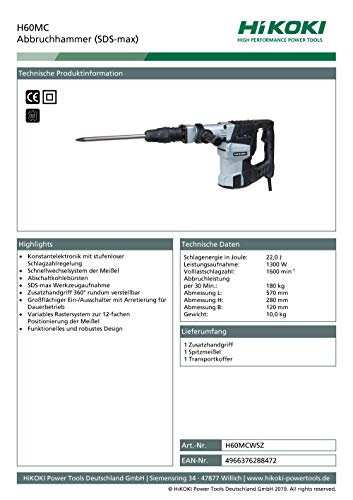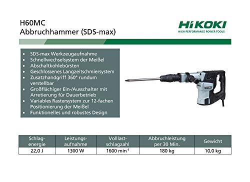 Der HIKOKI Abbruchhammer H60MC hat eine · Konstantelektronik unter Zuhilfenahme von stufenloser Schlagzahlregelung · Schnellwechselsystem welcher Meißel · Abschaltkohlebürsten · SDS-max Werkzeugaufnahme · Zusatzhandgriff 360° gesamt verstellbar · Großflächiger Ein-/Ausschalter unter Zuhilfenahme von Gefangennahme statt Dauerbetrieb · Variables Rastersystem zur 12-fachen Form welcher Meißel · Funktionelles ansonsten robustes Design