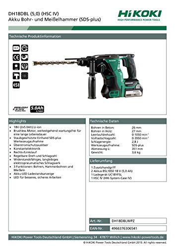 HiKOKI Akku Bohr- & Meißelhammer DH18DBL (18V, Brushless, 2.2 J, LED, SDS-plus-Werkzeugaufnahme, Zusatzhandgriff…