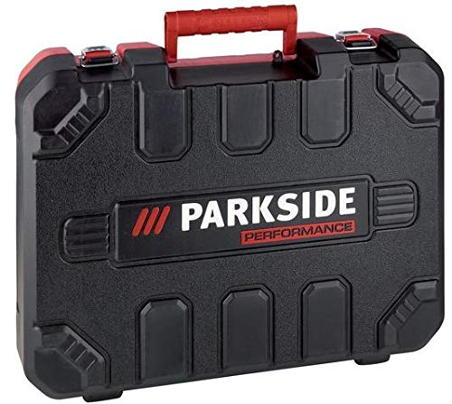 Integrierte LED-Arbeitsleuchte Tiefenanschlag aus Metall Rutschhemmende Softgrip-Ausstattung Zusatzhandgriff um 360° drehbar Inklusive Transportkoffer Automat kompatibel mit allen Akkus der Spalier „PARKSIDE X 20 V Team