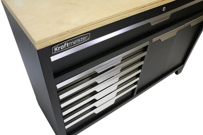 Kraftmeister Minnesota Werkstatteinrichtung – Männerküche mit 7 Schubladen und 3 Schränken – Werkzeugschrank, Garage – modulares Werkbank mit Holzarbeitsplatte (Multiplex) und Werkzeugwand – Schwarz