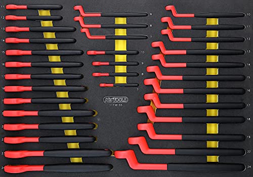 Ideale setsamenstelling voor hybride en elektrische voertuigen. Vaste indeling van het gereedschap door nauwkeurig inbedden. Geïsoleerd volgens IEC 60900. Antiblockiersystem-rand met vakken voor kleine onderdelen. Zeer stabiele plaatstalen constructie met 0,8 mm plaatdikte – torsiestijf. Hoge stabiliteit. Zijwanden met vierkante gaten voor het aanbrengen van verschillende accessoires. Afzonderlijke vergrendeling voorkomt ongewenst openen. Centrale vergren