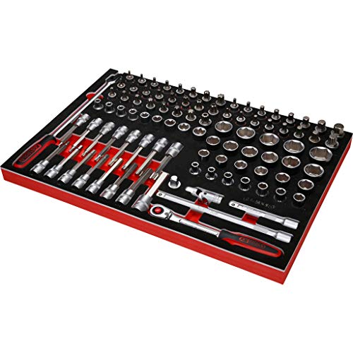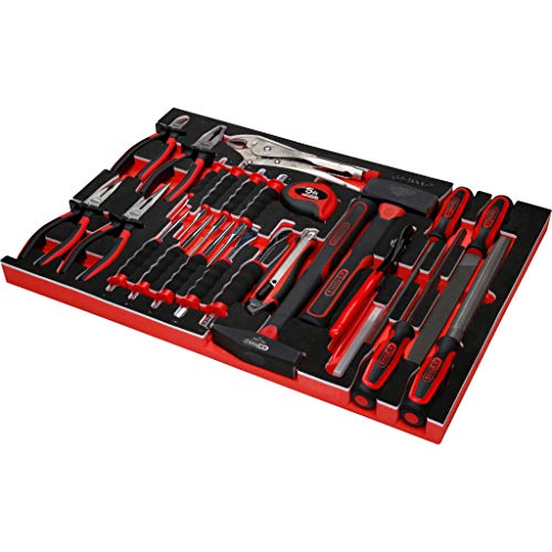 DER STARKE KOMPAKTE Der Werkstattwagen P15 überzeugt mit seiner extrem robusten Kunststoff-Arbeitsplatte in edlem Schwarz. Durch den Verzicht auf Edelstahl ist der P15 ein echtes Leichtgewicht und sorgt für maximale Anpassungsfähigkeit in der Werkstatt oder im Hobbykeller. Immerhin natürlich kann auch er eine Summe einstecken: Zum Beispiel bis zu 50 Kilogramm in jede seiner acht Schubladen. Und 600 Kilogramm Gewicht auf der Arbeitsfläche. Damit Sie mit dem P15 maximal unter Dampf stehen sind, sorgen wie bei allen Werkstattwagen von Performance Plus vier lenkbare Qualitätsrollen mit Bremse, die bei Zustellung bereits getestet und montiert sind. Sie können also sofort durchstarten. Alle acht Schubladen des P15 haben die Größe „M“. Das bedeutet für Sie maximalen Komfort in der Bestückung. Entweder Sie koordinieren Sich für eines der vorkonfektionierten Einlagenpakete oder Sie belegen die Schubladen komplett frei nach Ihren Vorstellungen. Egal, wie Sie sich koordinieren: Sie bekommen immer das Beste aus dem Sortiment von KS Tools mit über 45.000 Werkzeugen. LIEFERUMFANG: PERFORMANCEplus Werkstattwagen P15 . Schraubendreher-Satz in Schaumstoffeinlage, 24-tlg. Zangen- / Hammer- / und Meißel-Satz in Schaumstoffeinlage, 33-tlg. Schraubenschlüssel-Satz in Schaumstoffeinlage, 51-tlg. 1/2“ Steckschlüssel-Satz in Schaumstoffeinlage, 95-tlg. 1/4“ + 3/8“ Steckschlüssel-Satz in Schaumstoffeinlage, 156-tlg. Schraubenschlüssel-Satz in Schaumstoffeinlage, 40-tlg.