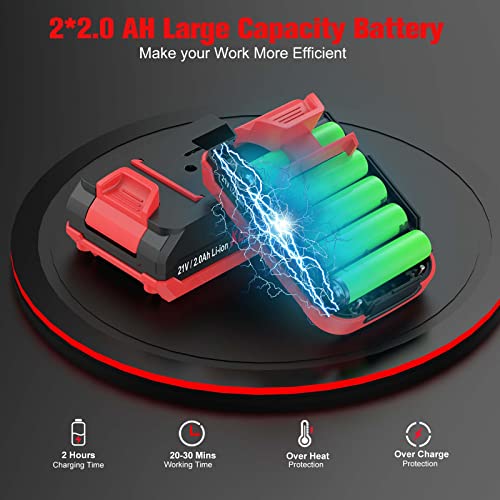 【2PCS 2.0Ah Batterien & Batterieanzeige】2*2.0Ah große Kapazität Li-Ion Batterie, es ist langlebig, dass Sie sich keine Sorgen machen müssen, dass der Strom in der Mitte des Schneidprojekts ausgeht. Akkumulator-Kettensäge hat aka eine Stromanzeige, um Sie über den Zustand der Batterie zu warnen, so dass Ihre Essay effizienter und bequemer.