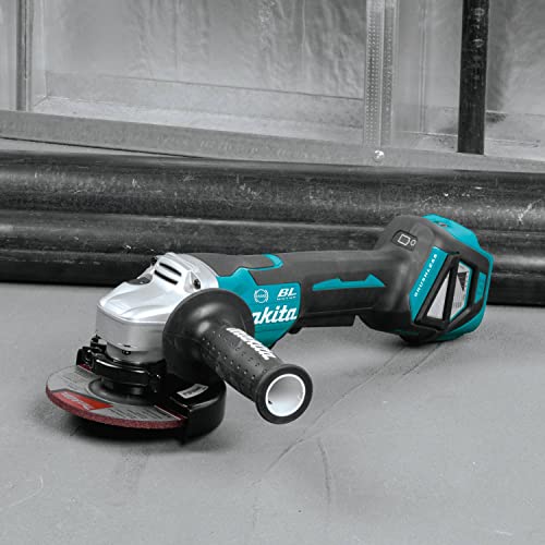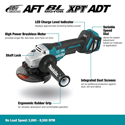 Akku-Winkelschleifer 18V / 125 mm; Anlieferung im Karton ohne Speicherzelle, ohne Akkuladegerät, ohne Koffer; äußerst handlicher Winkelschleifer mit 18 V-Maschine; LED warnt vor nachlassender Akkuspannung und Überlastung; Bürstenloser Antrieb für mehr Ausdauer, längere Lebensdauer und kompaktere Bauweise; Elektronisch regelbare Drehzahl; Mit Sanftanlauf; Mit Motorbremse; Mit nicht auf Dauerbetrieb arretierbarem Paddelschalter; XPT – Xtreme Protect Technology. Optimaler Abschirmung gegen Staub und Spritzwasser vulgo unterhalb harten Bedingungen; ADT Automatic torque Drive Technology. Dabei des Betriebs wird die Drehzahl automatisch reguliert, um je nach Anforderung eine optimale Leistung zu erzielen; AFT (Active Feedback sensing Technology) stoppt den Antrieb bei Blockieren des Werkzeugs; Technische Daten: Schleifscheibendurchmesser – 125 mm; Bohrung – 22,23 mm; Leerlaufdrehzahl – 3.000-8.500 min-1; Akkuspannung – 18 V; Maße (LxBxH) mm – 382x140x151; Gewicht – (inkl. BL1860B) 3,1 kg; Lieferumfang: 1x Seitengriff 36 Antivibration; 1x Schutzhaube 125 mm werkzeuglos; 1x Spannflansch; 1x Flanschmutter; 1x Stirnlochschlüssel 35mm; 1x Schruppscheibe 125mm 6mm INOX