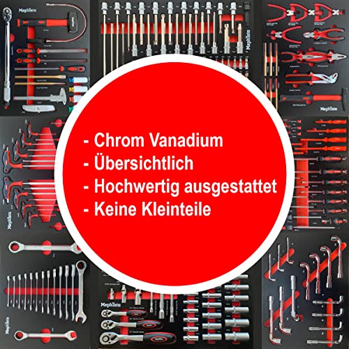 Mephisto Werkzeugwagen Werkstattwagen 8 Schubladen mit Werkzeug wie Schraubenschlüssel, Ratsche mit Nusskasten, Pfeifenkopfschlüssel usw. in Soft Inlays in Carbon Lock befüllte Schubladen