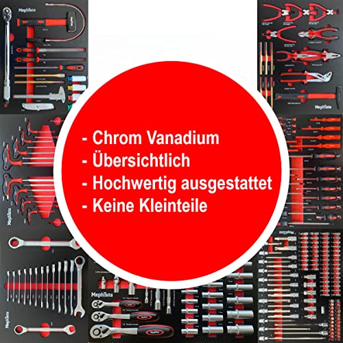 Mephisto Werkzeugwagen Werkstattwagen mit 8 Schubladen Davon 7 mit Werkzeug wie Schraubenschlüssel, Ratsche mit Nusskasten, Schraubendreher usw. in Soft Inlays in Carbonoptik befüllte Schubladen