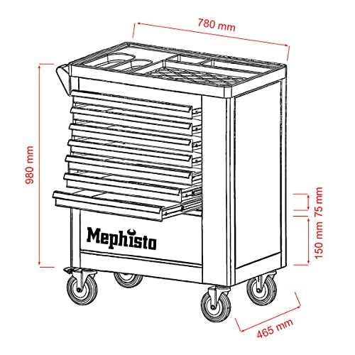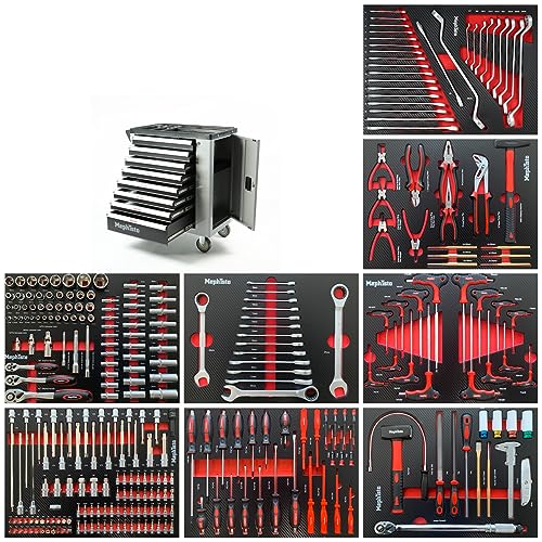 Mephisto Werkzeugwagen Werkstattwagen mit 8 Schubladen Davon 8 Schubladen mit Werkzeug wie Schraubenschlüssel, Ratsche mit Nusskasten, Ringschlüssel usw. in Soft Inlays in Carbonoptik befüllte
