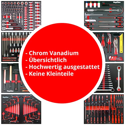 Mephisto Werkzeugwagen Werkstattwagen mit 9 Schubladen Davon 8 mit Werkzeug wie Schraubenschlüssel, Ratsche mit Nusskasten, Schraubendreher usw. in Soft Inlays in Carbonoptik befüllte Schubladen