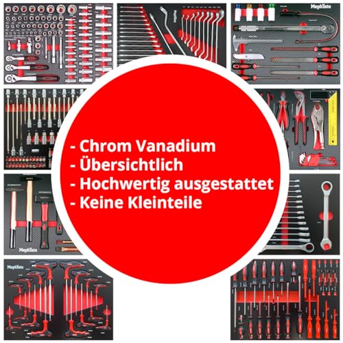 Mephisto Werkzeugwagen Werkstattwagen mit 9 Schubladen davon 9 Schubladen mit Werkzeug wie Schraubenschlüssel, Ratsche mit Nusskasten, Ringschlüssel usw. in Soft Inlays in Carbonoptik befüllte