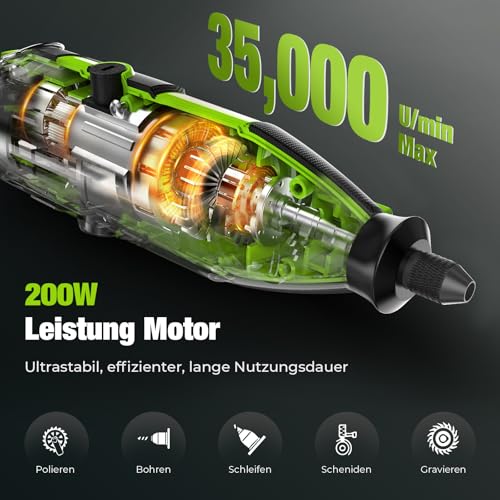 【Wirklich nützliche & professionelle Multifunktionswerkzeug】ETOOLAB – Tool Expert empfiehlt Ihnen dieses professionelle Elektroschleiferset: 200W verbesserter Motor aus reinem Kupfer – leistungsstarke und stabile Leistung; echte 10000-35000rpm Geschwindigkeit – erfüllt 95% Ihrer Nutzungsbedürfnisse; vernünftige 6-Gang-Abschaffung – einfach zu bedienen und einfach zu justieren; 129pcs komplettes Drehmelwerkzeug Set – keine Notwendigkeit, anderes Zubehör zu kaufen……