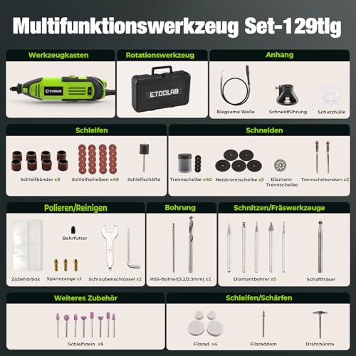 ![Multifunktionswerkzeug 200W, ETOOLAB [Professional] Rotationswerkzeug, Echte 10000-35000 U/min, Drehmelwerkzeug Set mit 129 Zubehören, 6 Variable Drehzahl für Schneiden, Gravieren, Bohren, usw. – Bild 7](https://m.media-amazon.com/images/I/51hyMR9HidL.jpg)
