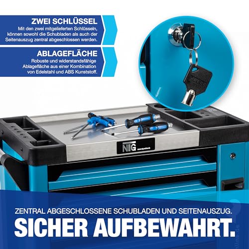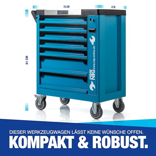 NTG Werkzeugwagen Werkstattwagen Werkzeugkasten Werkzeugkiste + Werkzeug m. Schaumeinlagen mit 7 Schubladen Davon 6 mit Werkzeug. Mit Soft Inlays in Carbonoptik befüllte Schubladen – Abschließbar