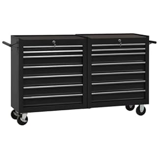 XXL-Werkstattwagen mit 14 Schubladen. Abschließbar. Große, rollende Werkstatt aus robustem Metall. Farbe: Schwarz. Material: Metall (Stahl). Maße Gesamt (mit Rädern) : 140x33x77,2 cm (L x T x H). Maße große Schubladen x10 (geteilt) : 51x29x8,5 cm (L x T x H). Maße kleine Schubladen x4 (geteilt) : 51x29x4 cm (L x T x H).