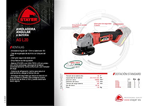 STAYER Lithium-Ionen-wiederaufladbare Batterie HGH-TECH, L20 mit Hilfe von Überladeschutz, Batterieentladung, Überhitzung, Kurzschluss. LED Ladeanzeige . Optimales Kühlsystem, um die Erwärmung zu verringern u. a. die Nutzungszeit zu verlängern.