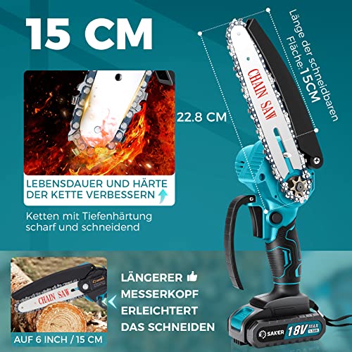 Saker Mini Kettensäge mit Akku 6 inch, kabellose kettensäge elektrisch mit 2 Ketten und 2 Batterie, 15 cm mit Sicherheitstaste Einhand Kettensäge Akku, Handkettensäge zum Schneiden von Äste und Garten