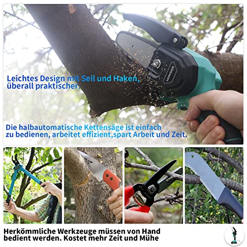 【Einhand-Bedienung】: Diese Mini-Kettensäge hat ein leichtes, weiches Design mit einem rutschfesten Griff, der in einem Rucksack getragen werden kann, wenn Sie unterwegs sind. Frauen können ihn leicht kontrollieren und verwenden und ihn über lange Zeiträume ohne Ermüdung aufrechterhalten.