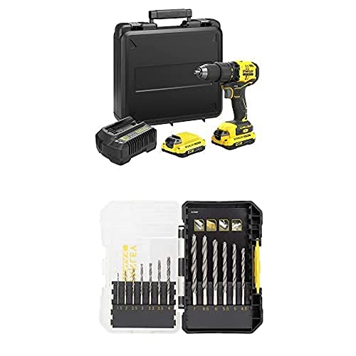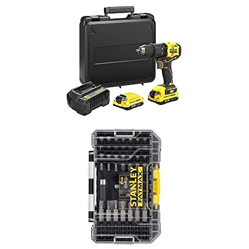 Stanley FatMax 18V 2-Gang Akku-Bohrschrauber SFMCD710D2K (2.0Ah, 60 Nm, bürstenloser Motor mit Vollmetallgetriebe, inkl. 2 Akkus & Ladegerät) + Stanley FatMax 13-tlg. Metallbohrer-Set STA88553