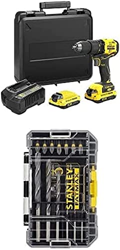 Stanley FatMax 18V 2-Gang Akku-Bohrschrauber SFMCD710D2K (2.0Ah, 60 Nm, bürstenloser Motor mit Vollmetallgetriebe, inkl. 2 Akkus) + Stanley FatMax 19-tlg. Metallbohrer- & Torsion Bit-Set STA88554