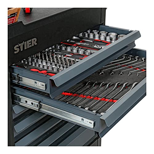 UMFANGREICHE BEFÜLLUNG: Der 241-teilig befüllte STIER Werkstattwagen ist ausgestattet 241 hochwertigen Werkzeugen der Marke STIER in vier Weichschaumeinlagen. Im Lieferumfang enthalten sind der 179-teilige Steckschlüssel-Satz, der 17-teilige STIER Schraubendreher- und Zangensatz, der 27-teilige Ringmaul- und Doppelringschlüsselsatz und