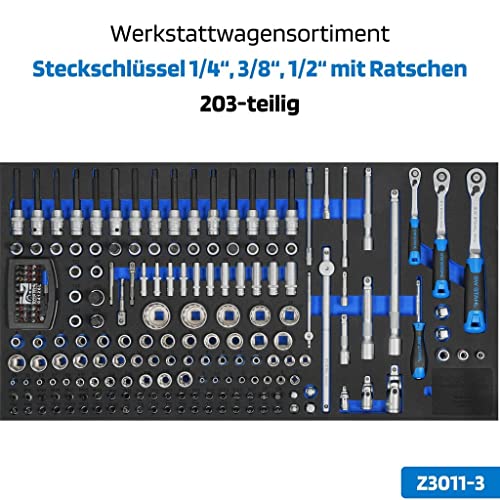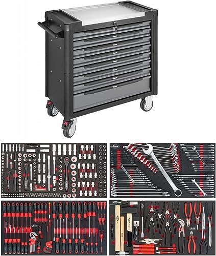 Schubladen: Der Wagen hat 8 Schubladen mit Schnellverriegelung und Einzugsautomatik. Dies ermöglicht ein geräuschloses Schließen. Die Schublade ist fest verschlossen und es ist keine zusätzliche Verriegelung notwenig. Ausgestattet mit 3 bestückten Schubladen und insgesamt 304 Werkzeugen. Bestückung: Sortiment aus Steckschlüsseln 1/4, 3/8, 1/2 Zoll inkl. Ratsche (203tlg); Schrauben- und Ratschenschlüssel (57tlg); Schraubendreher und Zangen (44tlg).