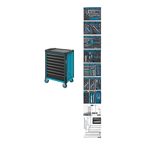 Der Profi – Werkstatt-Rollwagen ist ausgestattet mit 3 komplett bestückten Schubladen. Die anderen Schubladen können als Universal – Aufbewahrung von Werkzeug oder anderem Werkstatt – Bedarf verwendet werden. Der Werkzeugschrank bietet also genügend Platz für Ihr Arbeitsmaterial. Bestückung: Sortiment sämtliche Scheckschlüssel, 171-teilig; Schraubenschlüssel, 24-teilig; Zangen- und Schraubendreher, 12-teilig.