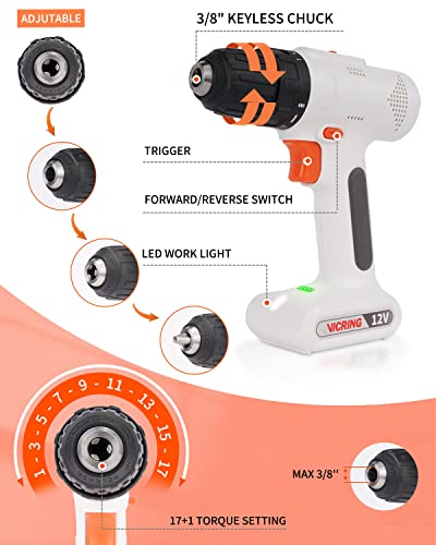 VICRING 12 V Akku-Bohrmaschine mit LED-Licht, weiß, elektrische Bohrmaschine, 17+1 Position, USB-Ladegerät mit 16 Bohrer…