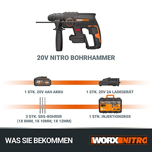 Lieferumfang: 1 x WORX WX381 Stromspeicher Bohrhammer, 1x WORX PRO 4Ah Stromspeicher WA3014, 1x Batterieladegerät WA3880, 1x Tiefenanschlag, 1x Zusatzhandgriff, 3x SDS-Bohrer (8, 10 und 12mm)