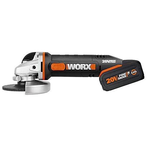 WORX WX803 Akku Winkelschleifer 20V -leicht mit Hilfsgriff – Leerlaufdrehzahl 8600/min – Scheibendurchmesser 125mm – Scheibewechsel ohne extra Werkzeug – mit 2 Akkus (2,0 & 4,0 Ah), Ladegerät & Koffer